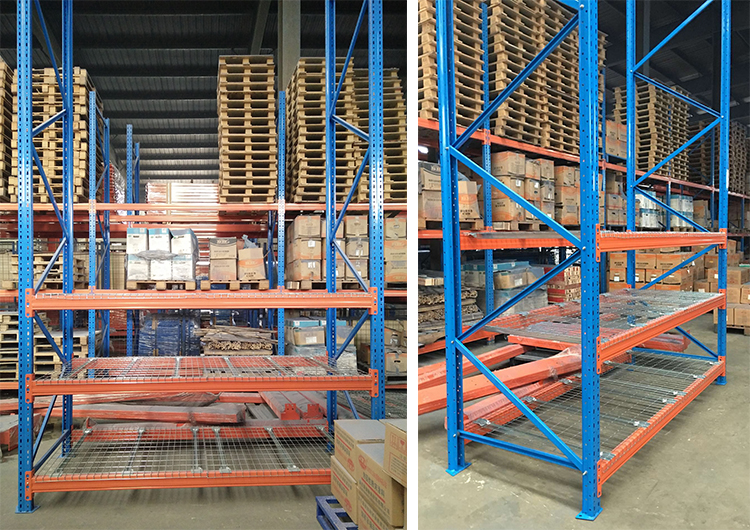 When the racking height is not high and the load per level is not very heavy, forklifts are not needed for retrieval, and pallets are not required for storage. Goods can be placed directly on the racking, in which case wire mesh decking can be used. The goods can be placed directly on the wire mesh decking. In this situation, the wire mesh decking plays the main load-bearing role, so materials with good load-bearing capacity will be chosen, and there will be more reinforcing ribs at the bottom.